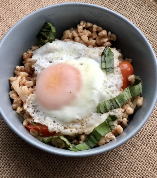 Any smoked salmon will do for this one although I wanted to find a use for this leftover sweet smoked salmon that we made for New Year’s Eve. If you have the time and access to a smoker (we used our Big Green Egg) it’s well worth the effort and not a very complicated recipe. I had some great miche bread leftover from Bien Cut, I spread on some cream cheese, added arugula, topped with a few pieces of salmon and garnished with a few sprigs of fresh dill. - Farro Topped with Egg