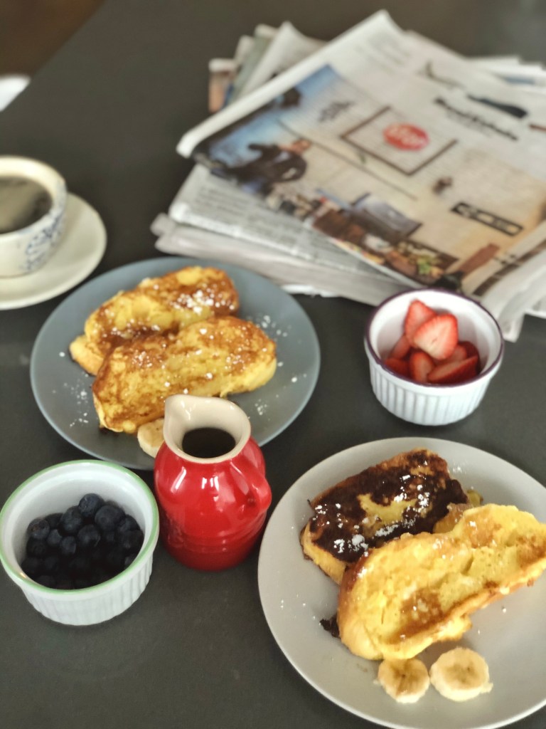 This seemingly decadent but super simple breakfast should be prepped the night before. The recipe is totally flexible – all you really need are chia seeds and a liquid (I usually use oat or almond milk) this time we had a plant based chocolate milk in the fridge which I wanted to use up. The proportions are 1 tbs of chia seeds for every 1/4 cup liquid. Because I used chocolate milk I didn’t need a lot of honey but you can add honey to taste or if you’re using regular oat or almond milk you can add a tbs of cocoa powder (or not)! Add all ingredients to a jar, stir a few times and let sit in the fridge overnight. When you’re ready to eat the next morning, top with sliced bananas or any topping of choice. - Challah French Toast