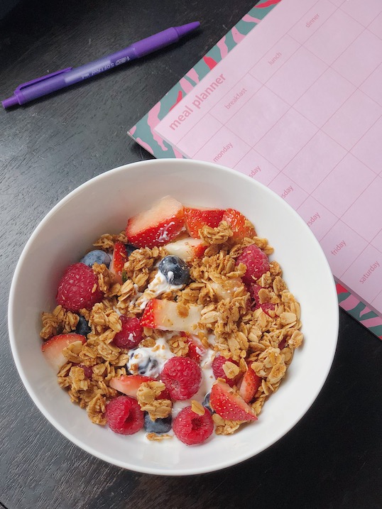 There is nothing better than French Toast using leftover challah. For this one, I used leftover challah I had made the day before using this winning recipe from Martha Stewart. Again, my general rule of thumb is two eggs for every one thickly sliced piece of bread, I add about a tbs of brown sugar, a dash of salt, tsp of vanilla and 1-2 tbs of milk to my egg mixture. Whisk everything together and soak bread for a few minutes before cooking. - Yogurt Parfait