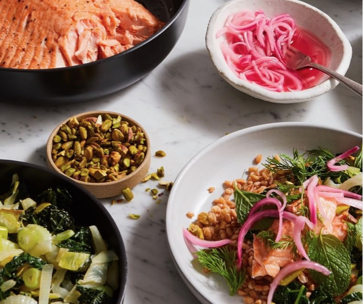 - By this time, salmon and farro should be about done and you can start getting creative with how to assemble the grain bowls. To serve family style, place farro in a large serving bowl, drizzle with 1-2 tbs of olive oil, squeeze juice from about ½ lemon, adding salt and pepper to taste. Top with greens and mix to combine. Sprinkle nuts (if using) and grated cheese, giving the entire bowl another stir. Top with pieces of flaked salmon and sprinkle with fresh herbs and chopped fennel fronds. You can also plate salmon on a serving dish and set up the rest of the ingredients like a DIY grain bowl bar, so everyone can customize to their taste.