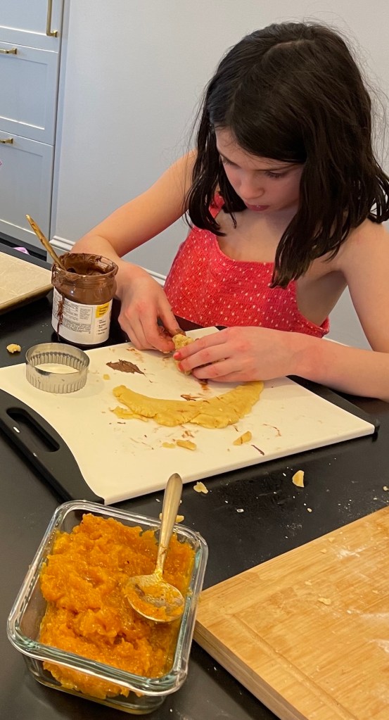 While we can aspire to make each cookie a perfectly golden three sided triangle, I loved watching the creative spirits of the kids emerge with this baking project. Their frustration in struggling to turn a circle of dough into a triangle transformed into entirely new cookie creations they named the apricot empanada, the Nutella blob face and the swirly whirly! See recipe for traditional Hamantaschens below but feel free to let your imagination run wild!