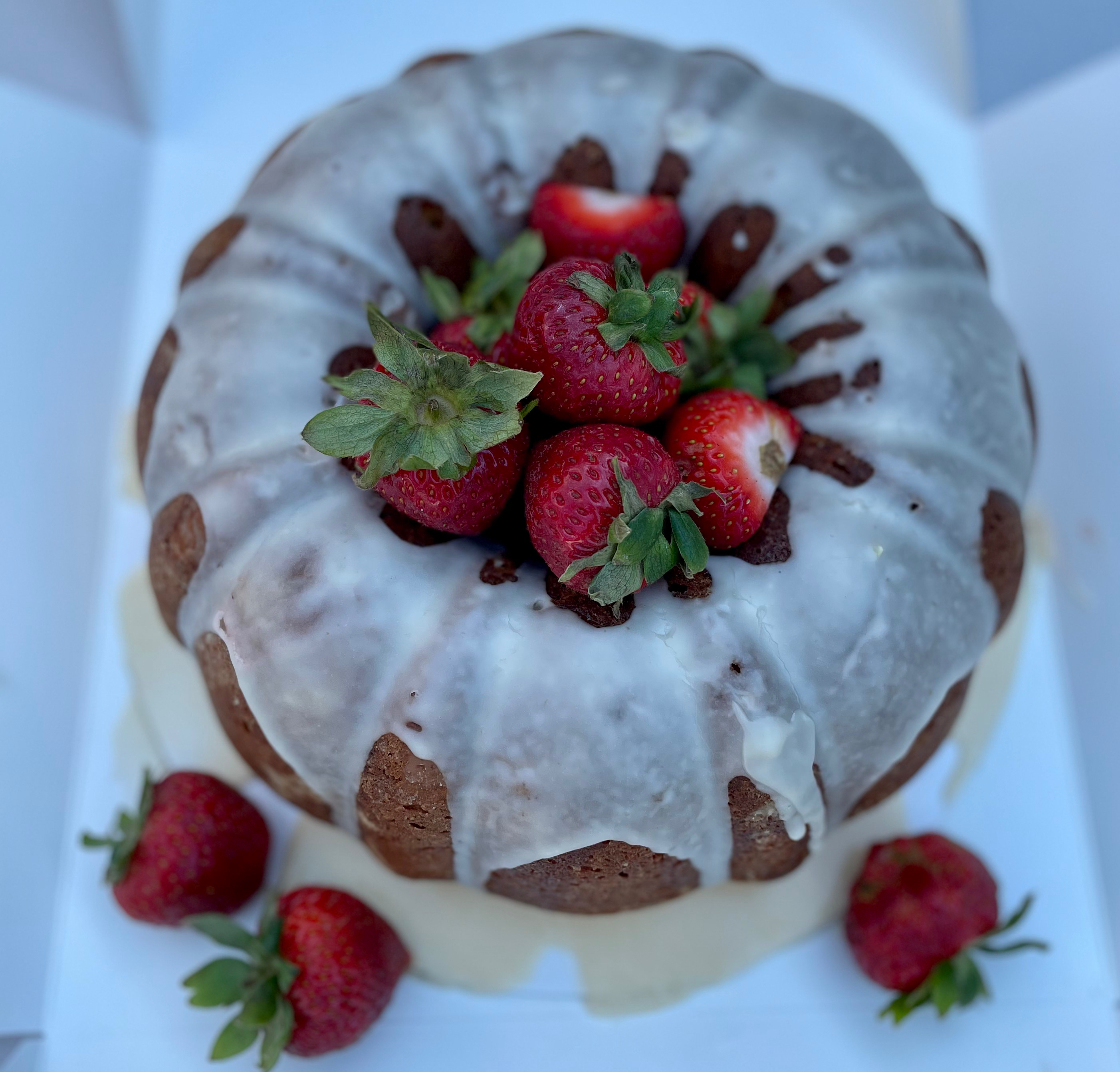 I’ve made this recipe numerous times and prefer to bake it in a bundt ban adorned with fresh strawberries. It works equally well in 2 loaf pans. I’m proud to say our entry for Lemon Pound Cake made second place in the bake-off, next year we’ll surely aim for first!